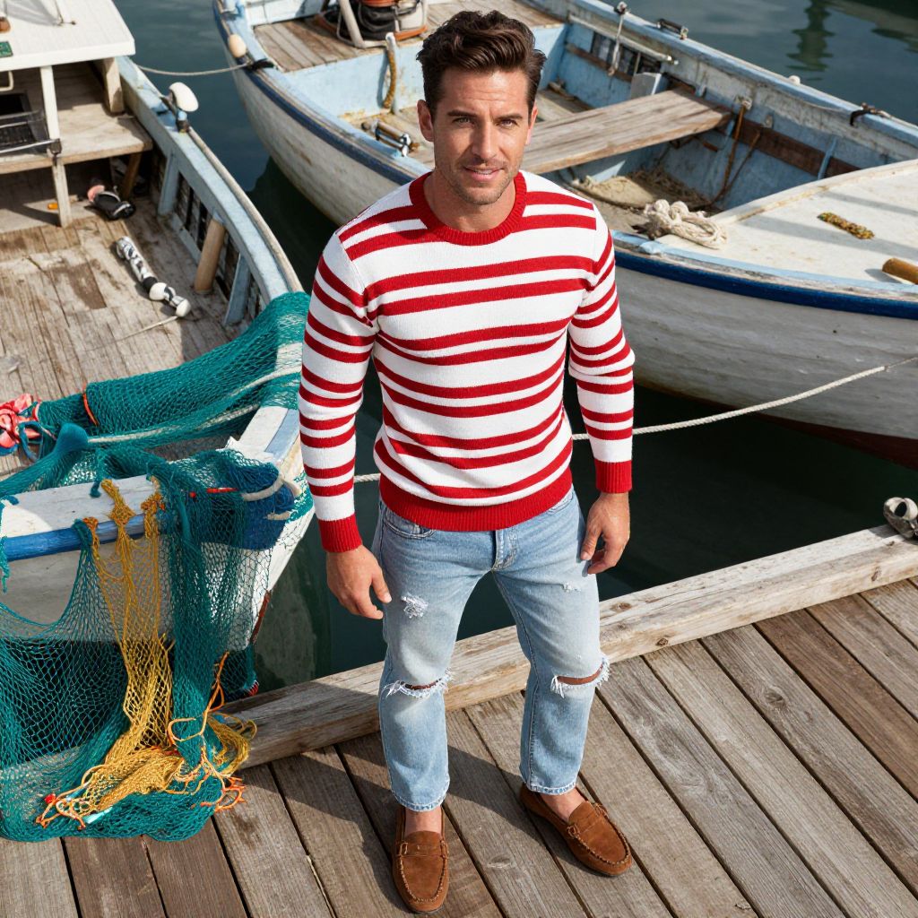 A man, red and white striped crewneck sweater, light wash distressed jeans, brown suede loafers, fitted look, retro-inspired charm, rustic wooden docks, weathered fishing boats, vibrant nets drying in the sun, overhead shot, relaxed smile, sun-kissed skin. Man has masculine face and piercing eyes