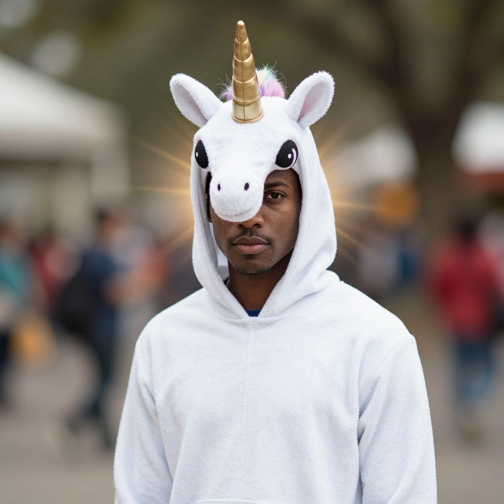 Photograph of a Black man with dark skin wearing a white unicorn costume hood featuring a gold horn, large black eyes, and white furry ears. The costume has a plush texture. He stands in an outdoor urban setting with a blurred background of people and trees. His expression is neutral, and he is centered in the frame. The costume's white color contrasts with the darker, out-of-focus background. The overall mood is whimsical and slightly surreal.
