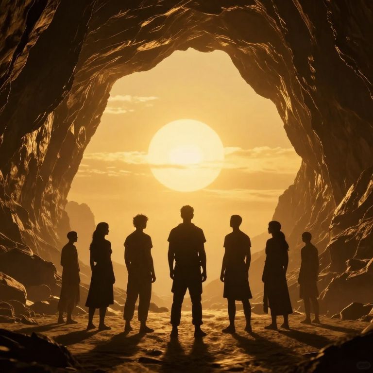 Amidst the golden glow of an otherworldly sun, a group of figures stands poised at the threshold of a cavernous expanse, their silhouettes etched in determination, symbolizing the timeless quest for enlightenment and the delicate balance between the known and the unknown.
