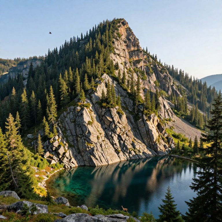 Natura mountain peak view, rugged cliffs covered in evergreen trees, a crystal-clear lake reflecting the sky, morning light casting gentle shadows, detailed natural elements including wildlife like deer and eagles, vibrant and majestic wilderness setting