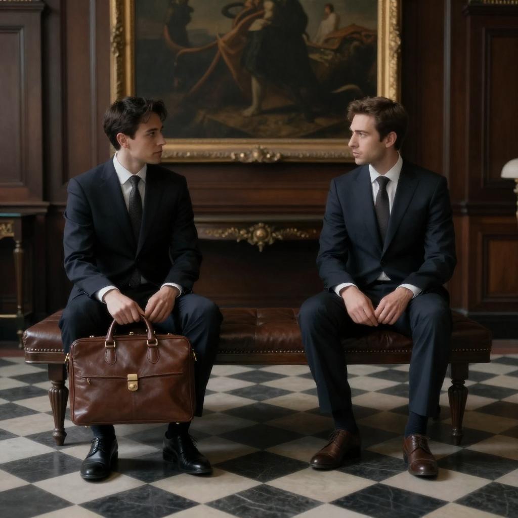Photograph of two men in dark suits sitting on brown leather benches in a dimly lit, ornate room with checkered floors. Both hold brown briefcases, facing each other. The man on the left has short dark hair, while the man on the right has brown hair. The background features a large, framed painting and ured walls.