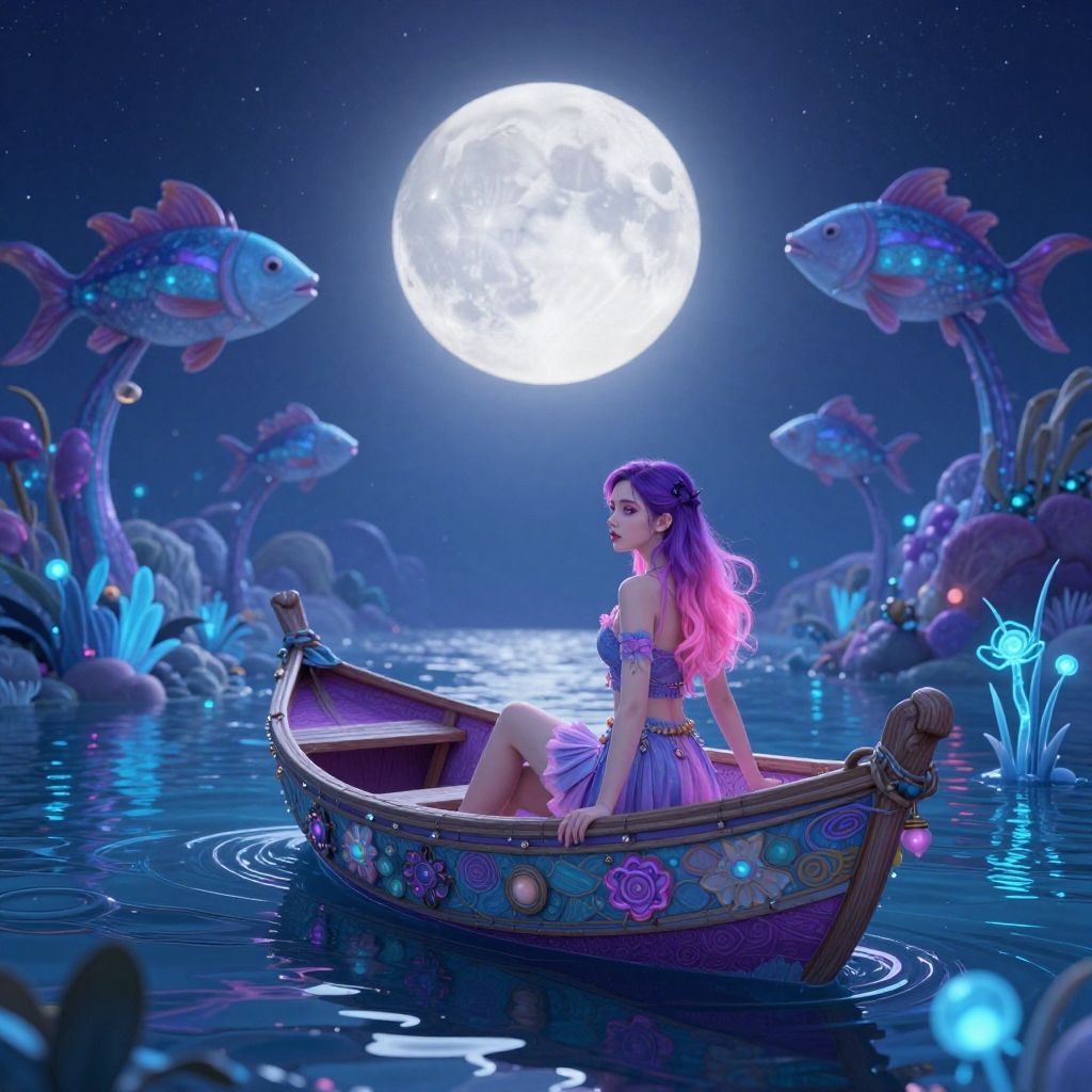 A vibrant digital illustration depicts a young woman with long pink and purple hair sitting in a wooden boat adorned with floral patterns, floating on a glowing, bioluminescent lake. She wears a purple, off-shoulder dress. The background features a large, luminous full moon casting a brilliant light, illuminating colorful, jellyfish-like fish swimming around her. The scene is surrounded by glowing plants and rocks, creating an enchanting, magical atmosphere. The water reflects the moon and bioluminescent lights, adding to the surreal, dreamlike quality of the image.