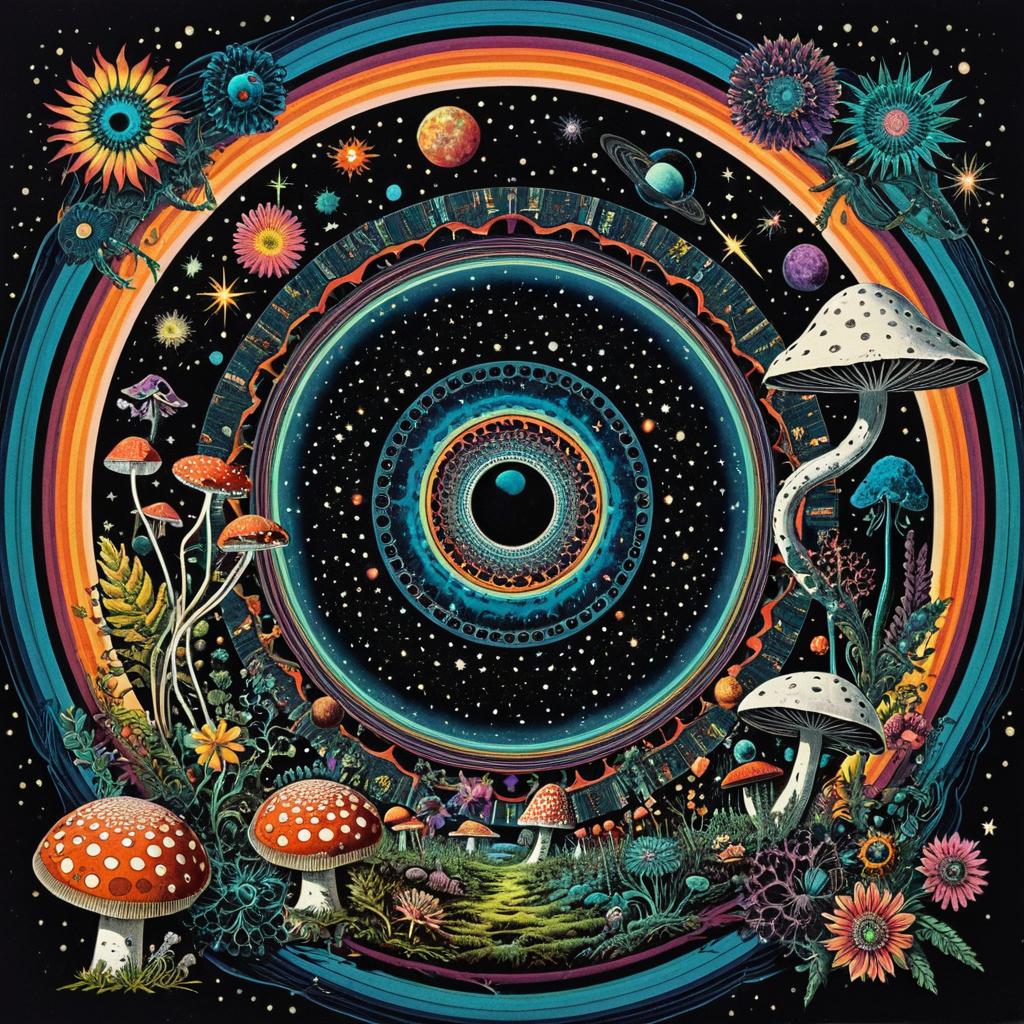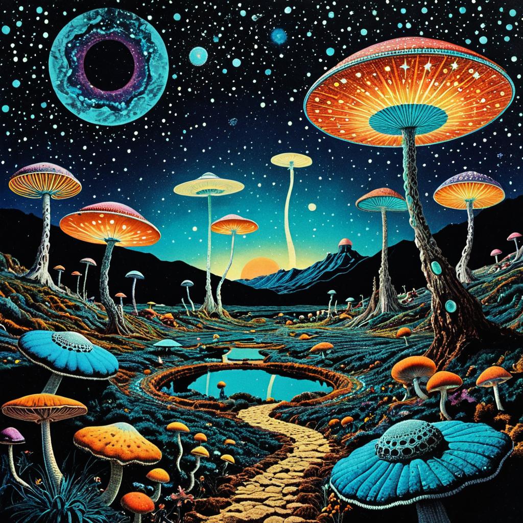 Vintage 70s psychedelic surreal sci-fi collage, multicolored starfields, rippling alien tundras, surreal alien landscapes, hovering iridescent UFOs, giant phosphorescent fungi, interconnected circular lace patterns, black night sky with stars