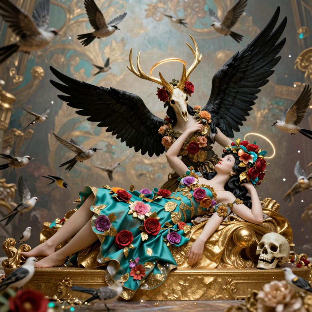 A falling icarus with black wings in the form of a greek sculpture with a mask in the form of golden elk skull and wreath of flowers, roses in hands, dressed in a flower dress, lie on a golden stone, silk, fabric, birds, flowers. baroque elements, human skull. full-length view. baroque element. intricate artwork by katsuhiro otomo. many many birds birds on background. trending on artstation. halo. octane render, cinematic, hyper realism, octane render, 8k, depth of field, bokeh. iridescent accents. vibrant. teal and gold and red colour scheme