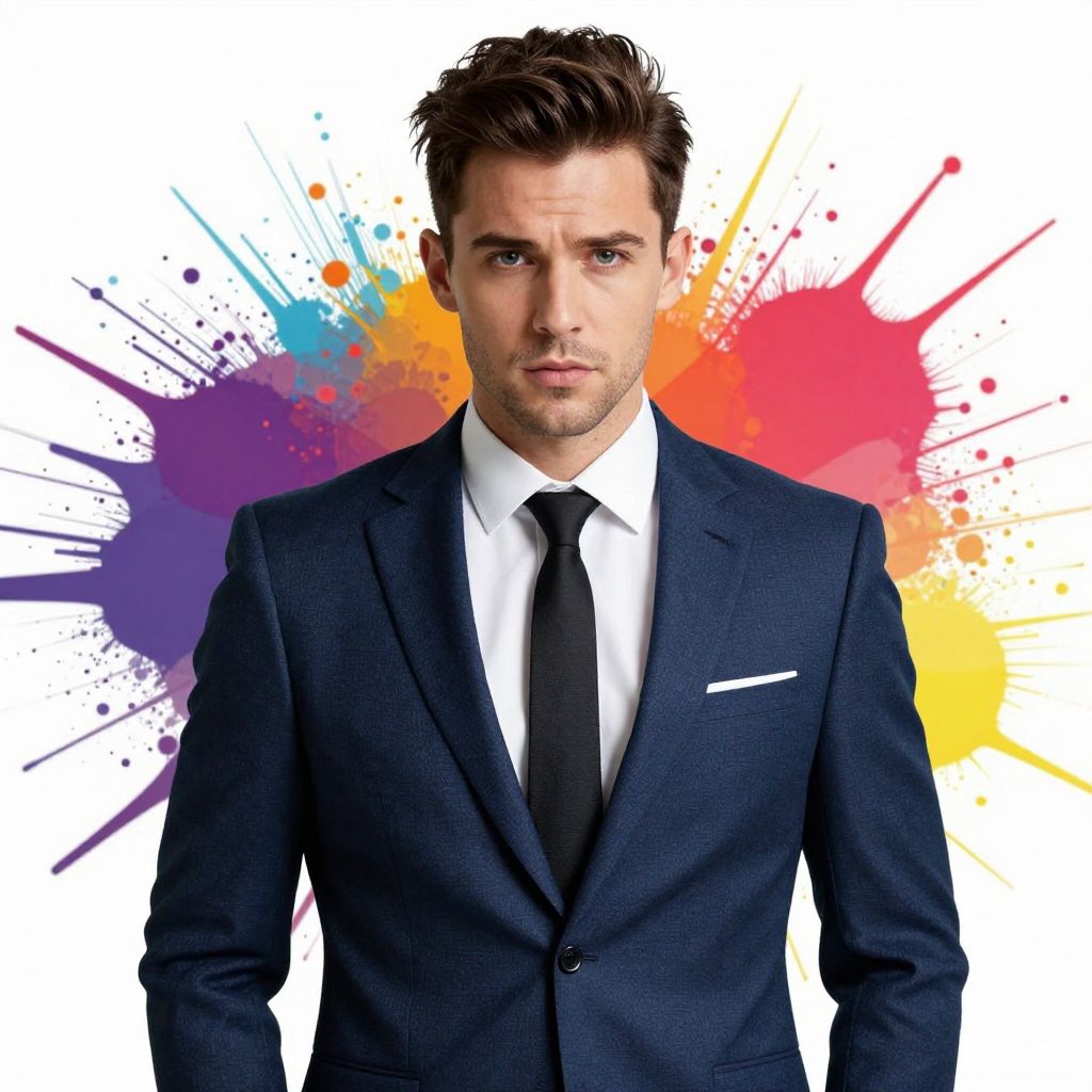 This striking artwork features a man in a stylish suit, exuding confidence and sophistication. The dynamic background, with bursts of vibrant colors, enhances the modern and artistic portrayal, creating a captivating visual contrast that draws the eye.