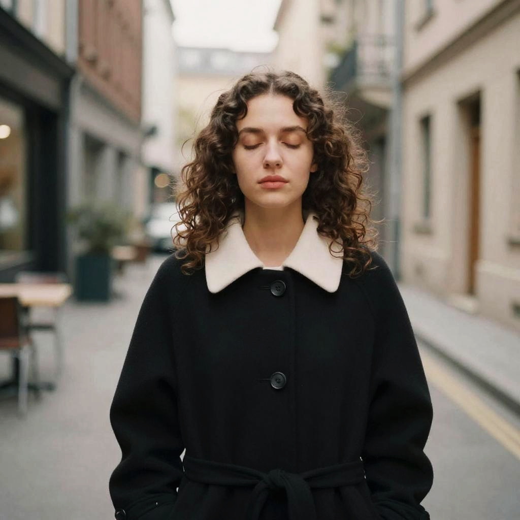 Photograph of a young woman with curly brown hair, closed eyes, wearing a black coat with a white collar, standing in a blurred urban alleyway