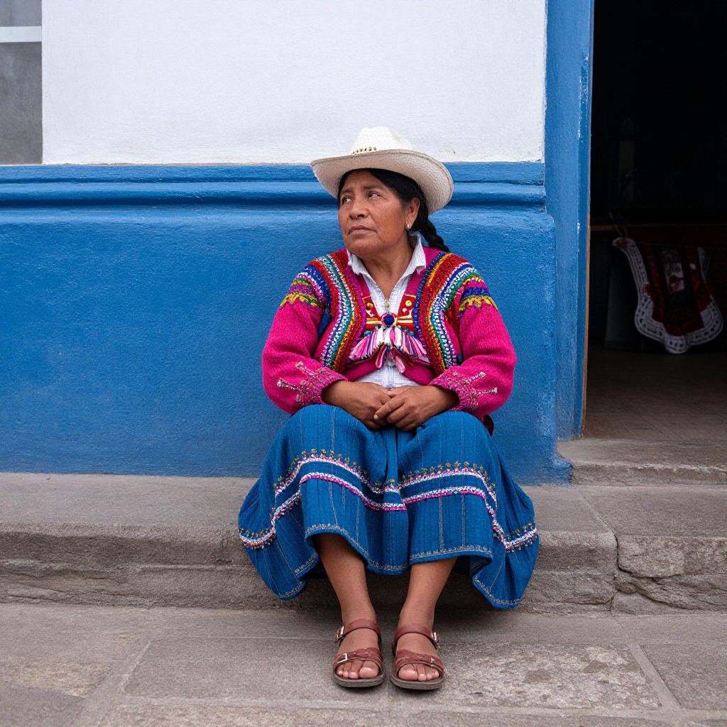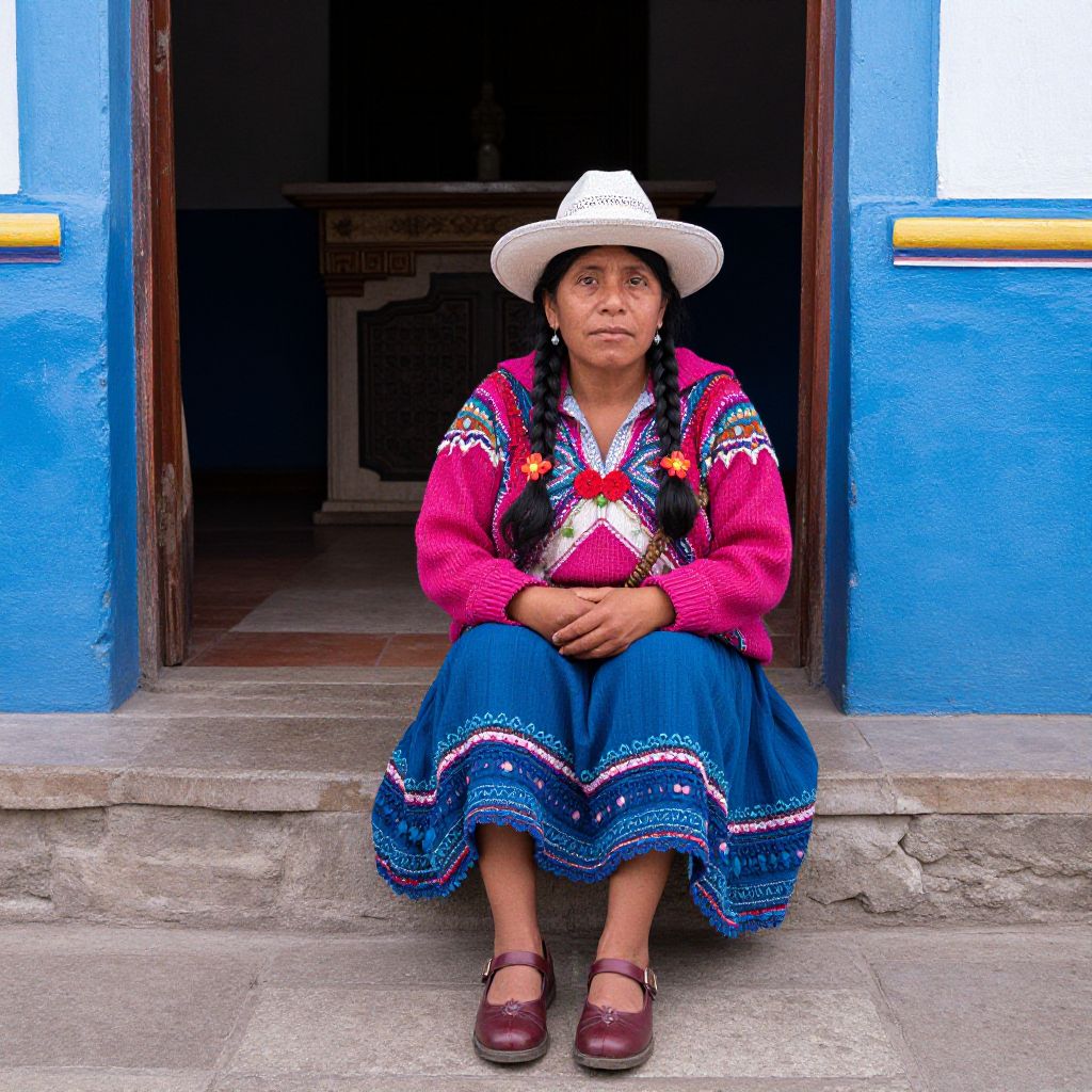 Photograph of an Indigenous Andean woman in vibrant traditional clothing, white hat, blue skirt, pink sweater, sitting at blue door entrance.