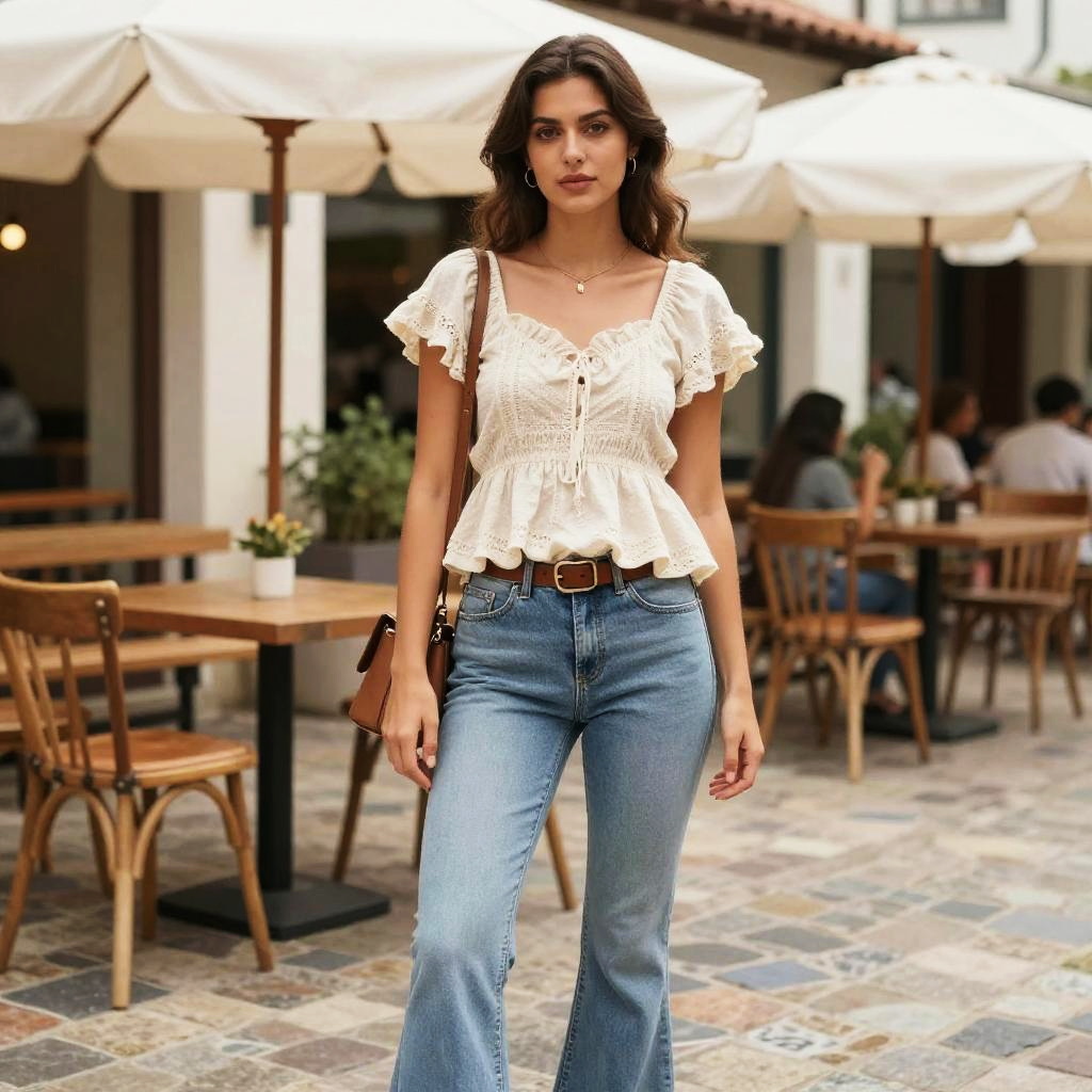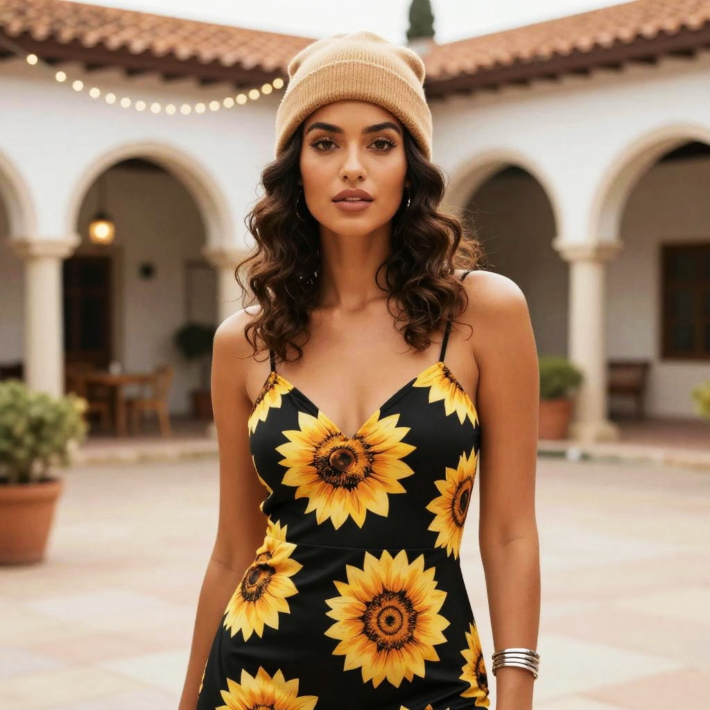 A woman, in a ufotable style, dressed in a fitted brown floral top and high-waisted blue jeans, wearing a teal knitted beanie, standing in a tropical garden with a rock garden. Sexy. Pretty face and beutiful eyes