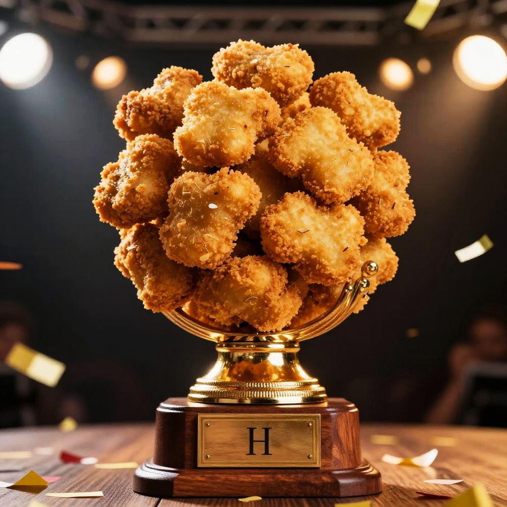 Close-up of a chicken nugget trophy made of perfectly fried nuggets, mounted on a polished wooden base, surrounded by confetti and bright stage lights, celebratory mood