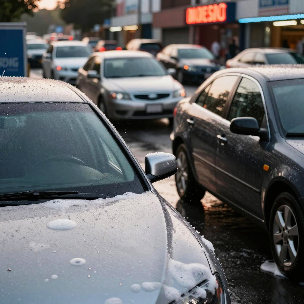 Prompt car wash in an urban setting, busy with various cars getting cleaned, neon signs glowing, detailed water droplets and soap suds, realistic reflections on shiny car surfaces