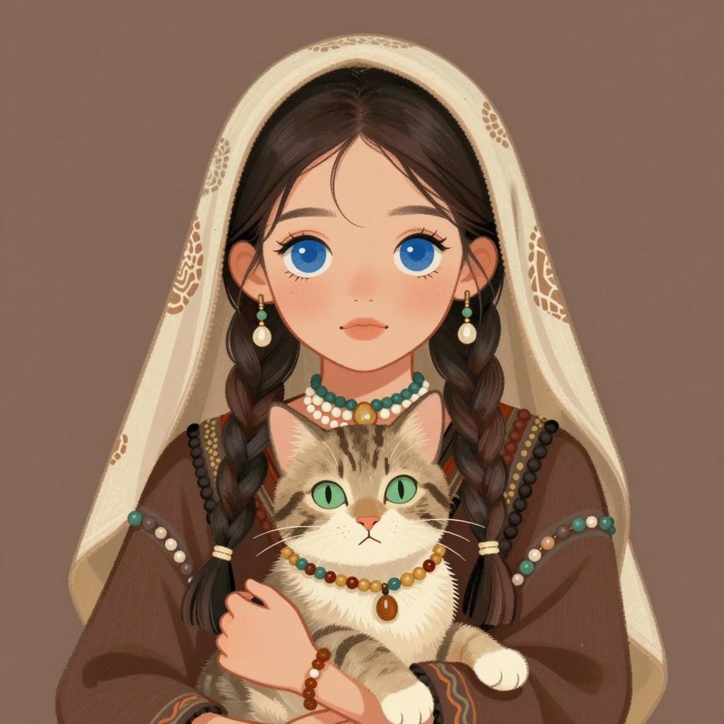 Illustration of a young girl with large, intense blue eyes, wearing a colorful, floral-patterned headscarf. A gray cat with yellow eyes is directly behind her head, looking forward. Girl's lips are slightly parted, and her expression is serious. Headscarf has intricate designs in orange, green, and blue. Girl's dark hair peeks from under the headscarf. Cat's ears are visible above the girl's shoulders.