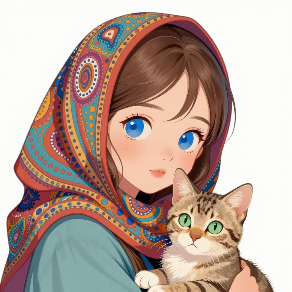Illustration of a young girl with large, intense blue eyes wearing a colorful, floral-patterned headscarf in orange, green, and blue. The girl has dark hair partially visible under the headscarf, with slightly parted lips and a serious expression. A gray cat with striking yellow eyes sits close beside her, looking forward. The scene features intricate designs on the headscarf and a close-up portrait style on a white background.