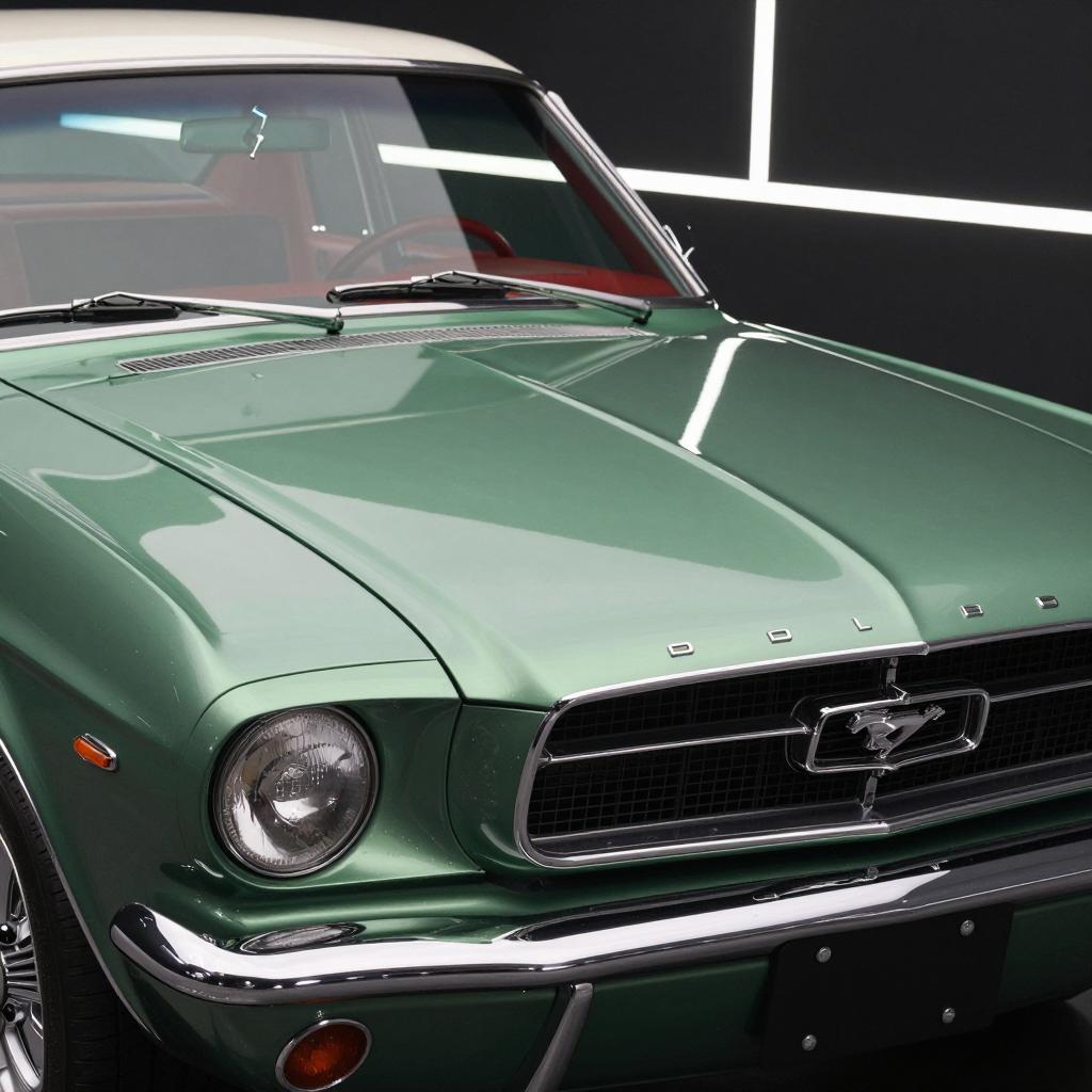Close-up front view of a vintage green Ford Mustang car showcasing its iconic grille with the Mustang emblem, round headlights, and chrome bumper. The car features a sleek hood with vents and a vibrant, glossy finish. The interior appears red with a visible steering wheel, all set against a dark background with bright linear lights.