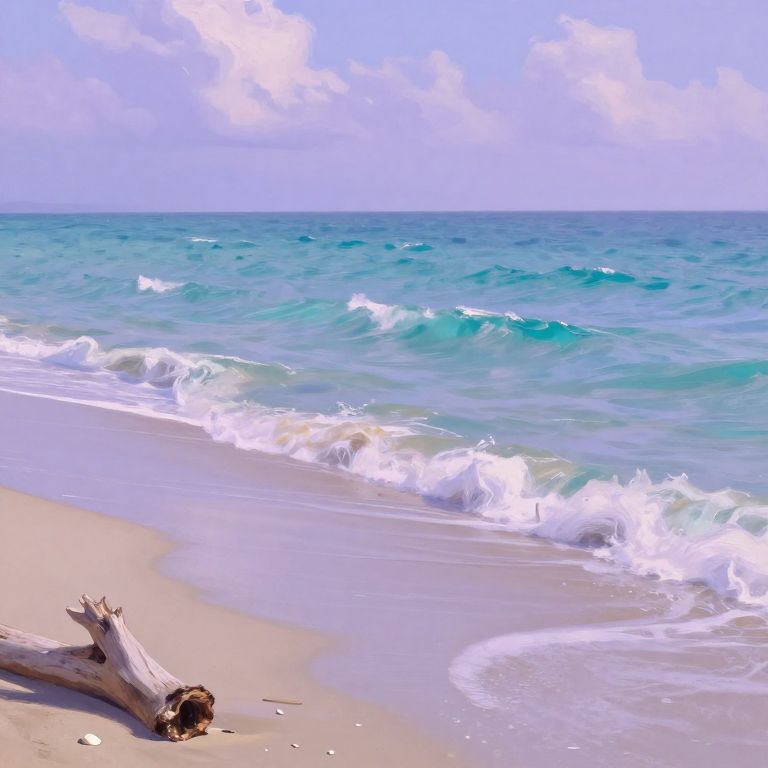 Create an idyllic seascape in an impressionistic style, capturing the enchanting dance of waves illuminated by soft lavender and turquoise light. Depict this tranquil scene from an elevated viewpoint above a serene coastline where the distant horizon merges seamlessly with the sky dotted with clouds. Employ a soft-focus technique to emphasize gentle ripples caressing sandy shores, integrating details like weathered driftwood and seashells scattered along the shore, all rendered in delicate brushstrokes that suggest movement and harmony between land and water, evoking feelings of serenity and tranquility.