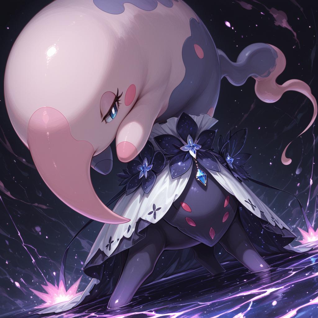 Digital art of a fantasy creature resembling a ghostly pink jellyfish with a large, smooth, pale pink head and a dark, bulbous body adorned with red spots. The creature has a single, blue, half-lidded eye with long lashes, giving it a mystical appearance. It wears a dark, elegant, gothic-style cloak with white, glowing floral accents and blue gemstones. The background is a dark, cosmic space with purple and blue hues, and glowing white energy trails emanate from the creature's feet, adding a dynamic, powerful feel. The overall style is vibrant and magical, with a mix of soft and sharp textures.