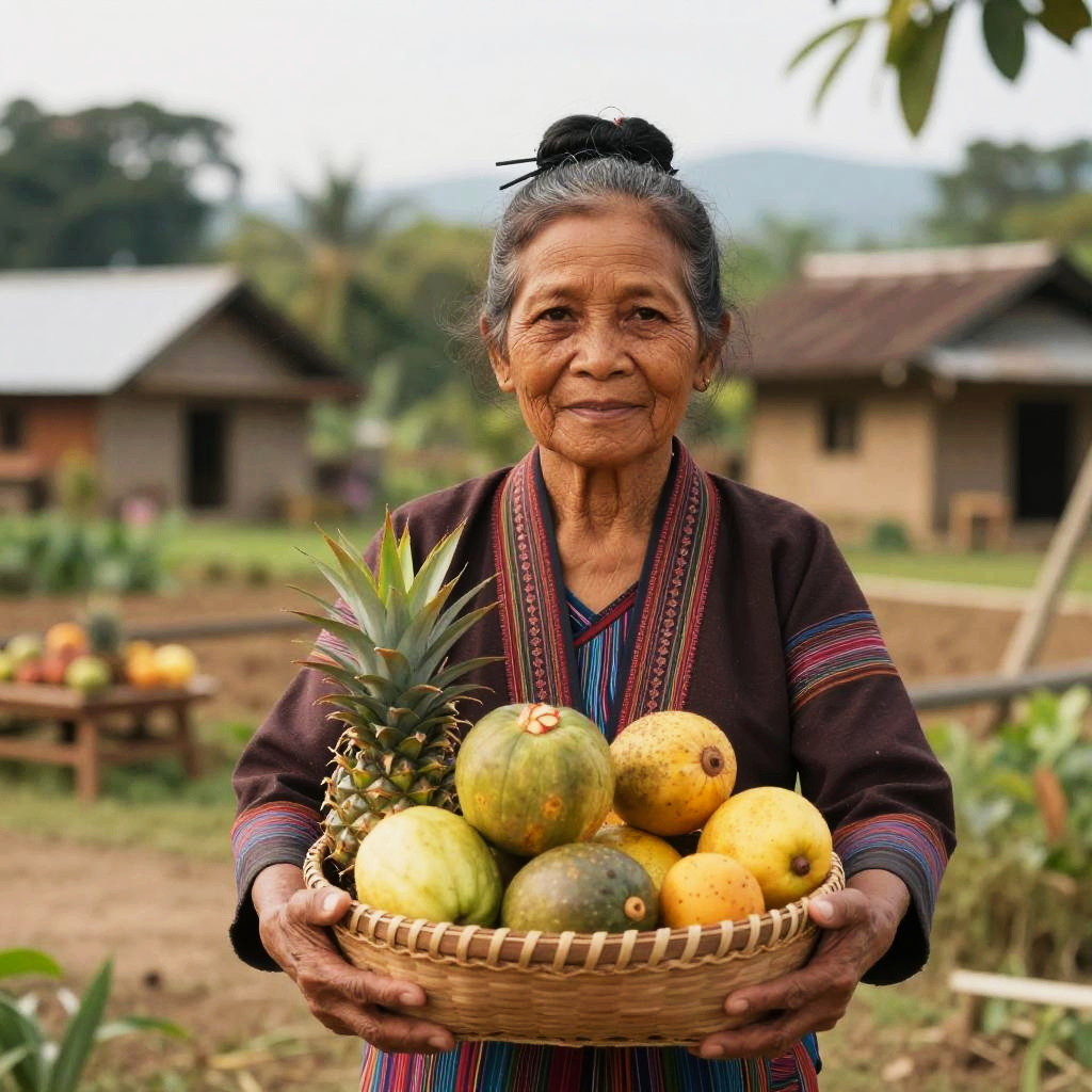 60 year old Filipino woman in traditional attire, holding a woven basket filled with tropical fruits, surrounded by rural Philippine village background, warm tones and gentle breeze effect, highlighting her strong connection to Filipino heritage and nature