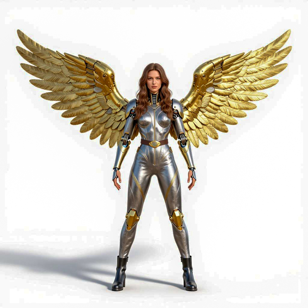 Mechanical angel wings, photorealistic, woman with golden wings, silver jumpsuit, brown belt, black boots, gold cuffs, long brown hair, standing, white background, full body, wings spread, modern fantasy style, studio lighting, front view, symmetrical composition