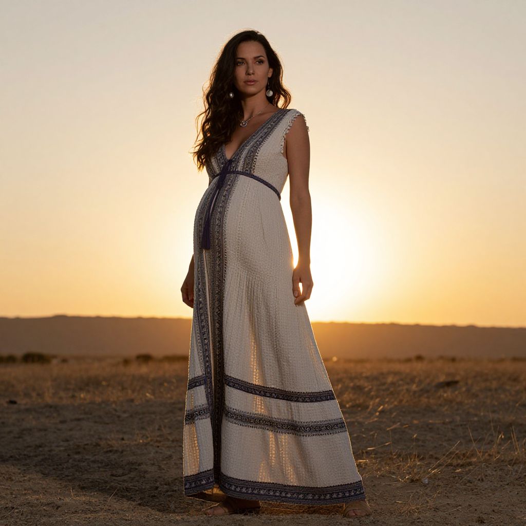 Woman in boho maternity dress for photoshoot at sunset