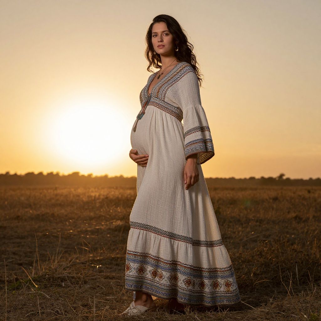 Photograph of a pregnant woman with long, wavy dark hair standing in a grassy field at sunset. She wears a long, white, embroidered dress with blue and red patterns at the sleeves and hem. Her right hand rests gently on her rounded belly. The sun is low on the horizon, casting a warm, golden glow across the scene. She stands with a calm, serene expression, looking slightly to the right. The background is a simple, open landscape with a clear sky, enhancing the peaceful, natural setting.