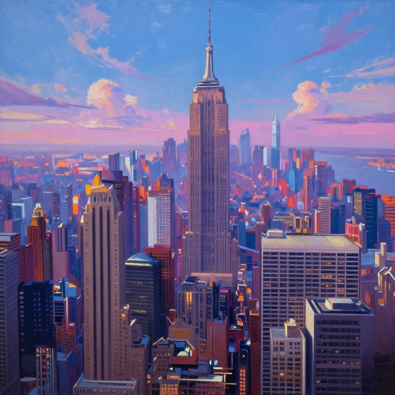 Digital artwork of a vibrant, colorful New York City skyline at sunset, featuring the iconic Empire State Building center frame.