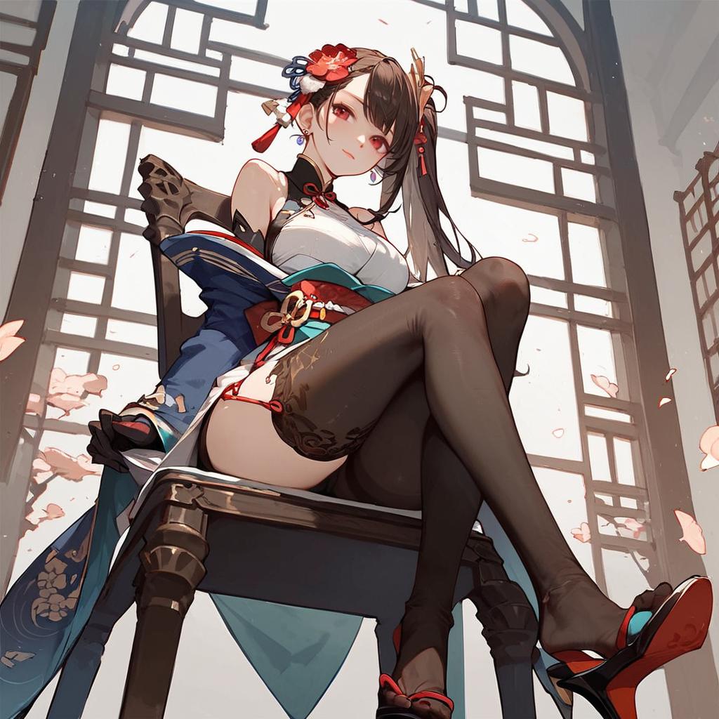 Score_9, score_8_up, score_7_up, score_6_up, source_anime, 1girl, solo, folded ponytail, glasses, black robes, sash, black skirt, hakama skirt, armband, upper body, japanese architecture, outdoors, looking at you, medium breasts
