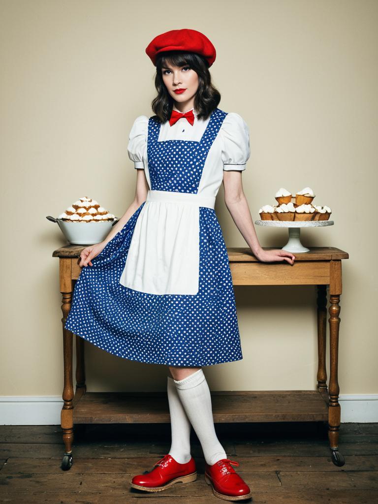 Full-body portrait of a male model crossdressing in a blue polka dot dress with a white apron, white puff-sleeve blouse, red bow tie, matching red beret, white knee-high socks, and red shoes. The subject stands indoors against a beige wall, leaning on a wooden table with a bowl of cream-topped pastries and a cake stand of cupcakes. The style references a vintage British baking show aesthetic.