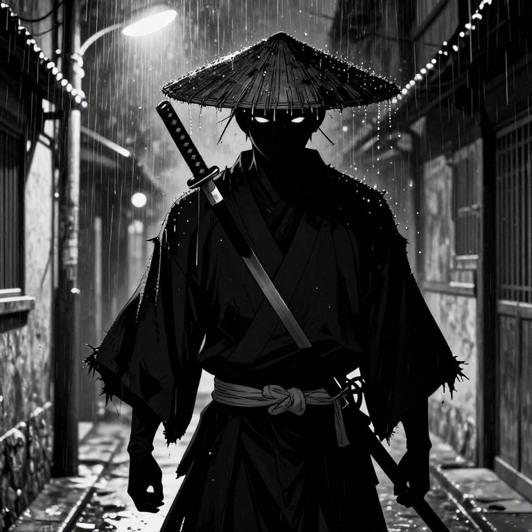 Image of a wispy samurai enveloped in a shroud-like material, appears to be merging with the smoke around them, high contrast between the dark moonlit background and the bright, glowing texture of the material to give a feeling of emergence or transformation, monochrome shades to enhance the mysterious and intense atmosphere, Light reflects off katana, A smokey cloudiness wisps all around, with bright red colors slashed across for a pleasing aesthetic, giving the impression that the katana is cutting the air