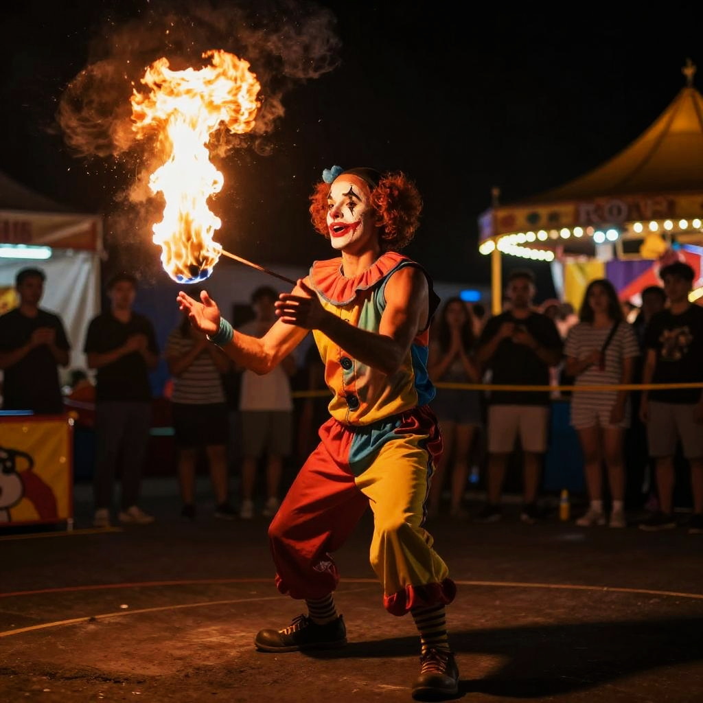 Hot clown performing daring fire juggling act on a dimly lit carnival stage, intense flames casting dramatic shadows on colorful costume, fierce expression with smudged red lipstick, dynamic motion blur capturing heat and excitement.
