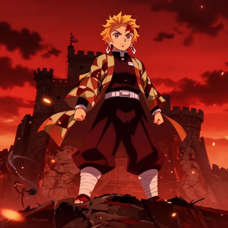 Blonde demon slayer characters standing atop a ruined castle at dusk, crimson sky in background, fierce and determined looks, wearing traditional samurai-inspired demon slayer uniforms with ornate patterns, swirling wind and flying embers, cinematic and vibrant