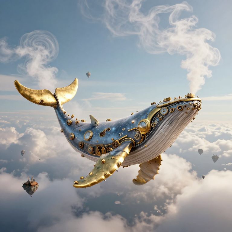 A towering clockwork whale swims through the sky, its brass flukes churning clouds into spiral patterns as it exhales steam that coalesces into tiny floating islands.