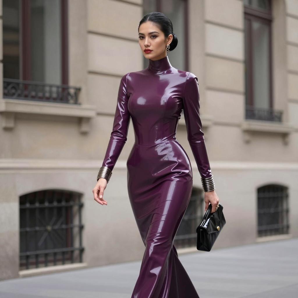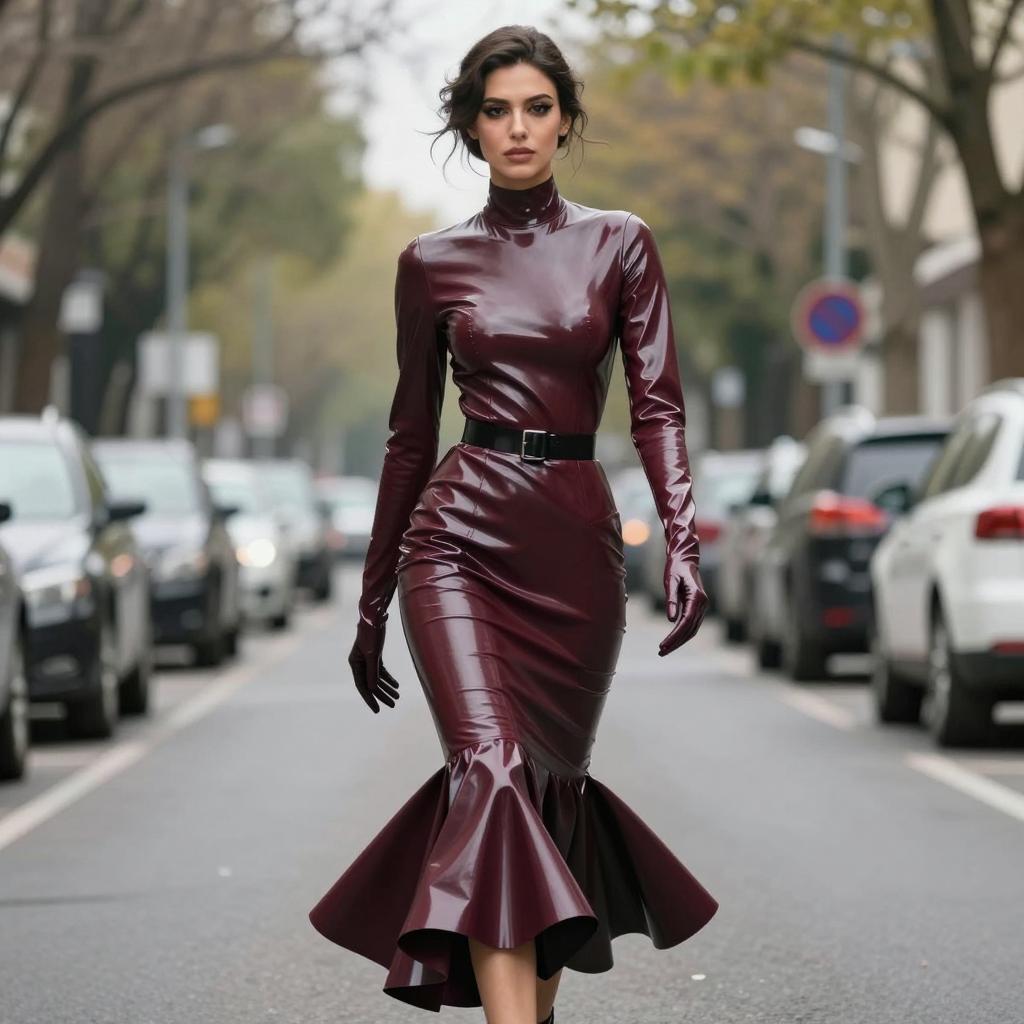 Fetish fashion woman in high-neck latex top and mermaid skirt, woman with long auburn ponytail and bold matte lips wearing wine-red latex top tucked into glossy black maxi skirt with thin belt with gold buckle and glossy pumps walking striding forward with focused expression and flowing latex skirt in architectural plaza with repeating concrete columns, street fashion photography, overcast daylight, ultra-detailed