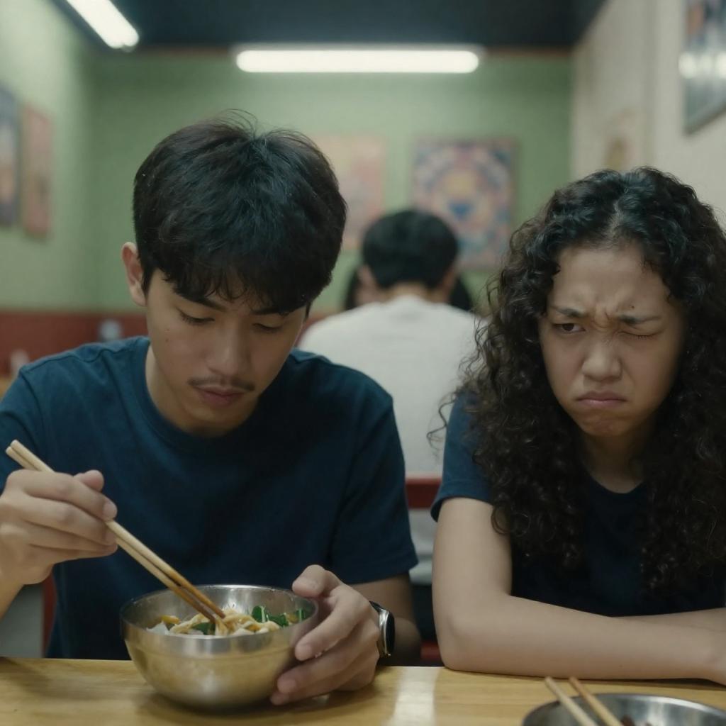 Photograph of a traditional Japanese kitchen. Five men and one woman, all Asian, eat at a counter. Woman in white headscarf and floral dress stands left. Men wear hats and vests, focused on eating. Large metal pots, bowls, and glasses on counter. Background has hanging calligraphy. Steam rises from pots. Woman's expression neutral, men focused on food. Dim lighting.