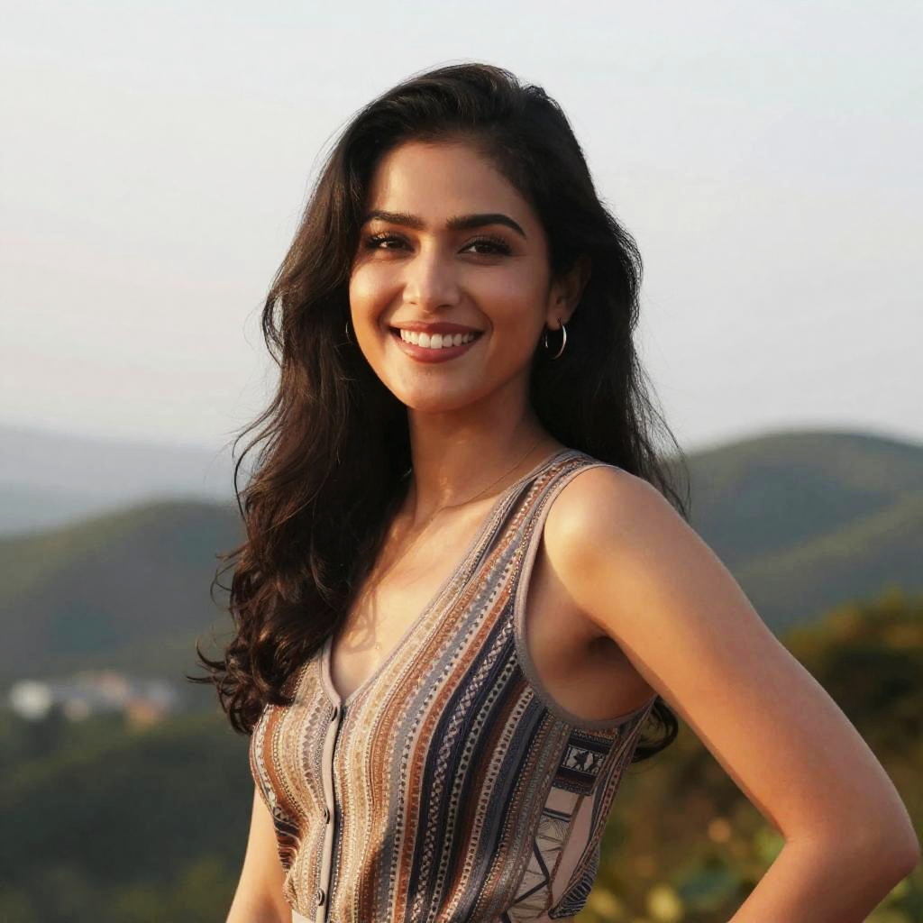 A smiling woman with long dark hair poses outdoors, exuding warmth and confidence. She wears a stylish sleeveless top that enhances her cheerful demeanor, set against a scenic backdrop of hills and a serene sky.