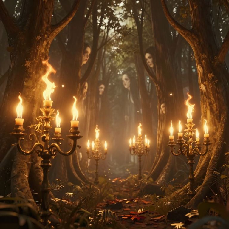 In a hauntingly ethereal 3D-rendered forest, towering candelabras cast flickering golden-hour light, their flames dancing dramatically as they transform into fleeting, ghostly portraits of unseen figures, evoking a surreal and otherworldly atmosphere.