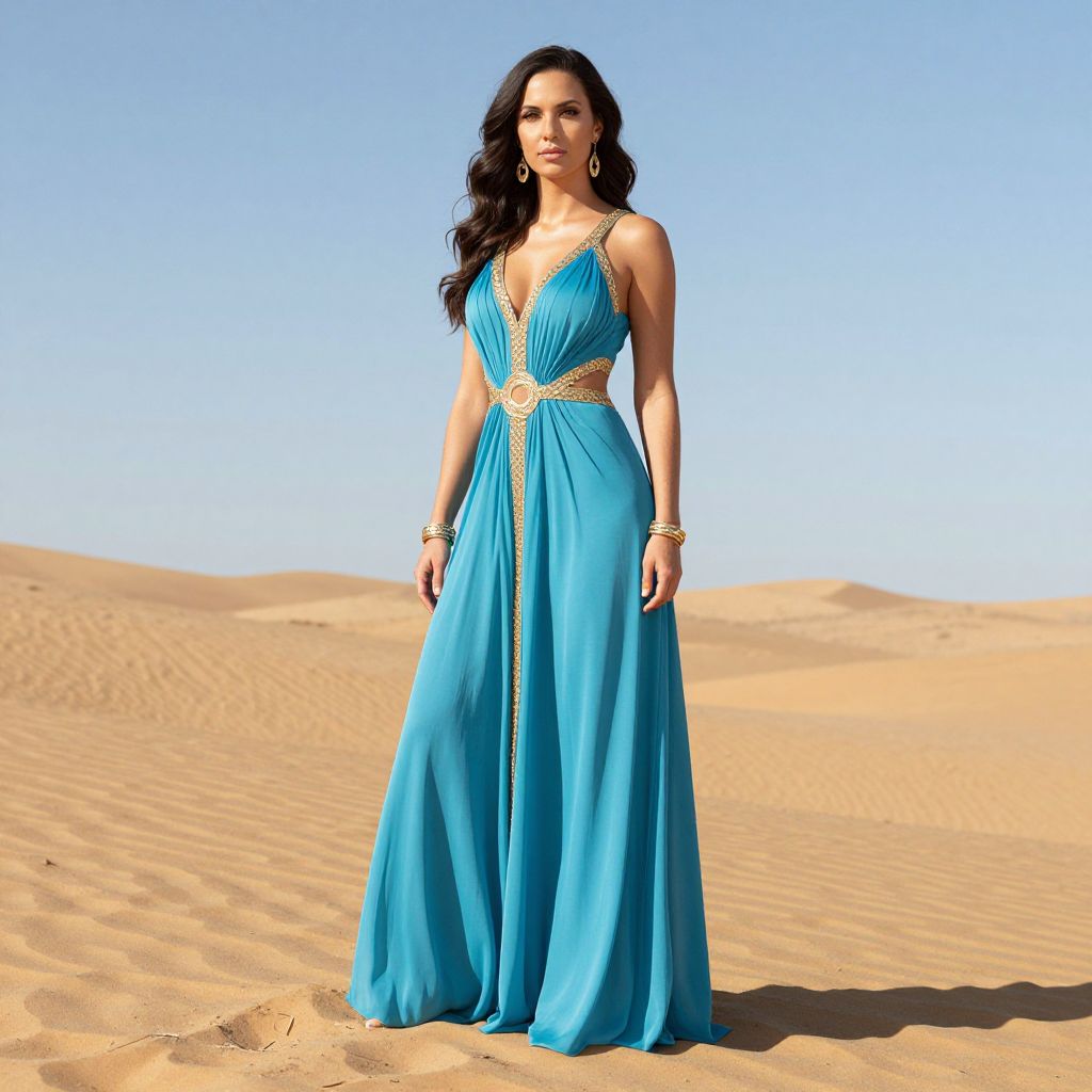Photograph of a beautiful woman with long, wavy black hair standing in a bright blue desert under a clear sky. She wears a flowing, floor-length, turquoise gown with a deep V-neck and gold embellishments at the waist. Her dress has thin straps and a cinched waist, accentuating her hourglass figure. She accessorizes with gold bangles on her right wrist and large hoop earrings. The sand dunes behind her are golden and textured, creating a stark contrast with her vibrant dress. The sunlight casts soft shadows, highlighting the desert's patterns and her elegant attire.
