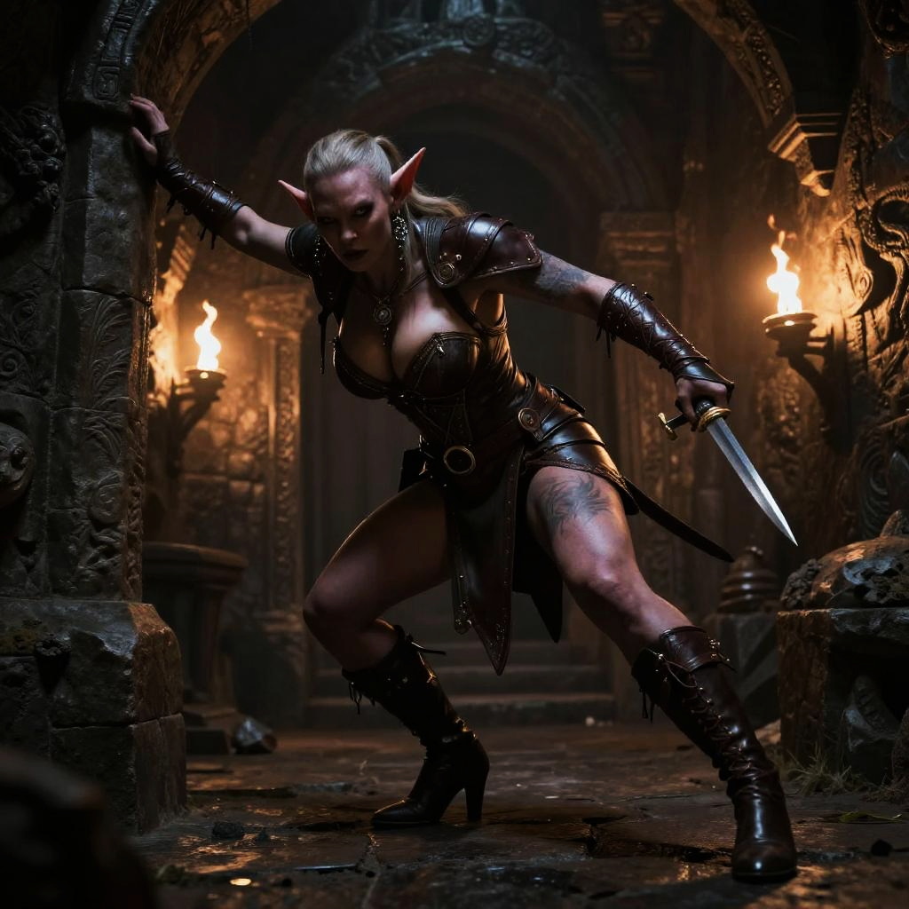 Busty goblin rogue sneaking through shadowy dungeons, wearing dark leather gear with hidden blades, sleek and agile body posture, dim underground environment with ancient stone walls and flickering torches, dramatic lighting emphasizing stealth and cunning, fantasy noir aesthetic