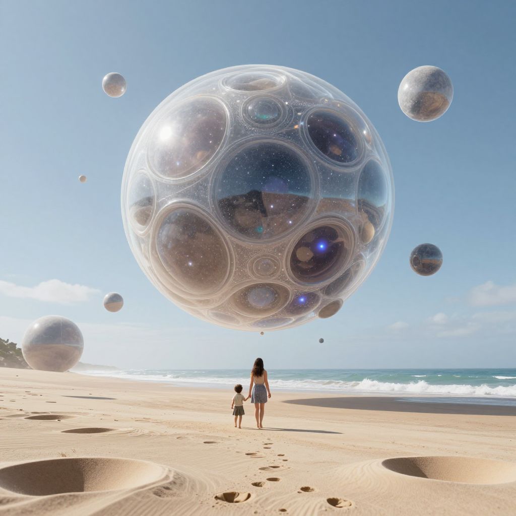 A surreal 3D-rendered scene depicts a colossal, otherworldly orb composed of giant bubbles and liquid stardust hovering over a desolate beach, as a woman and child walk toward it, surrounded by floating orbs and pockets of dimensionally warped sand, evoking a dreamlike, cyberpunk-inspired fantasy aesthetic.