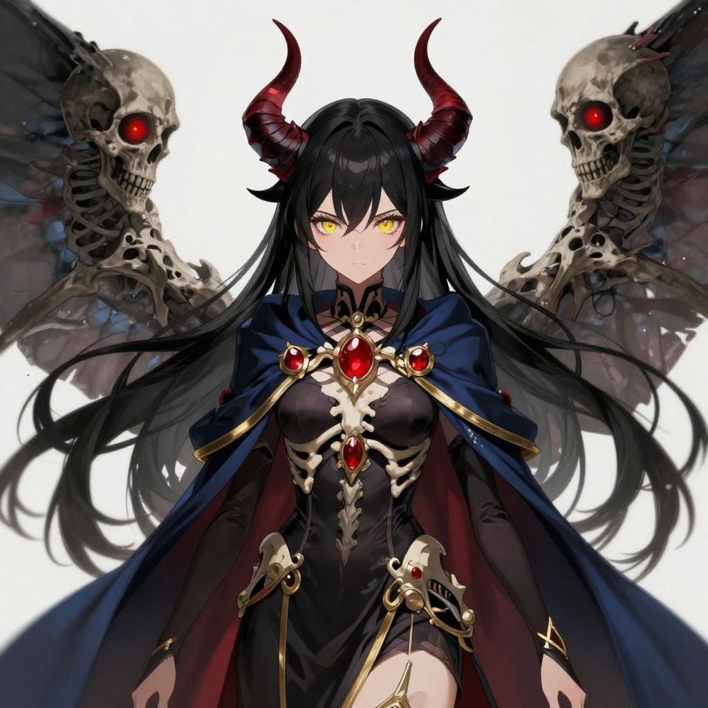 Anime-style illustration of a demon girl with long black hair, yellow eyes, and large demonic horns. She wears a dark blue and gold cloak adorned with a large red gem, and a detailed outfit featuring a skeletal design on her torso. Surrounding her are skeletal wings with a red eye attached, enhancing her ethereal and menacing appearance.