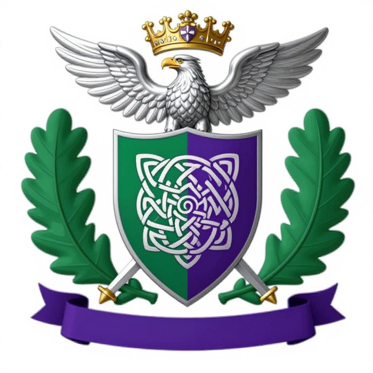 Coat of arms with silver eagle, gold crown, green and purple shield, Celtic knot, green laurel leaves, and purple banner.