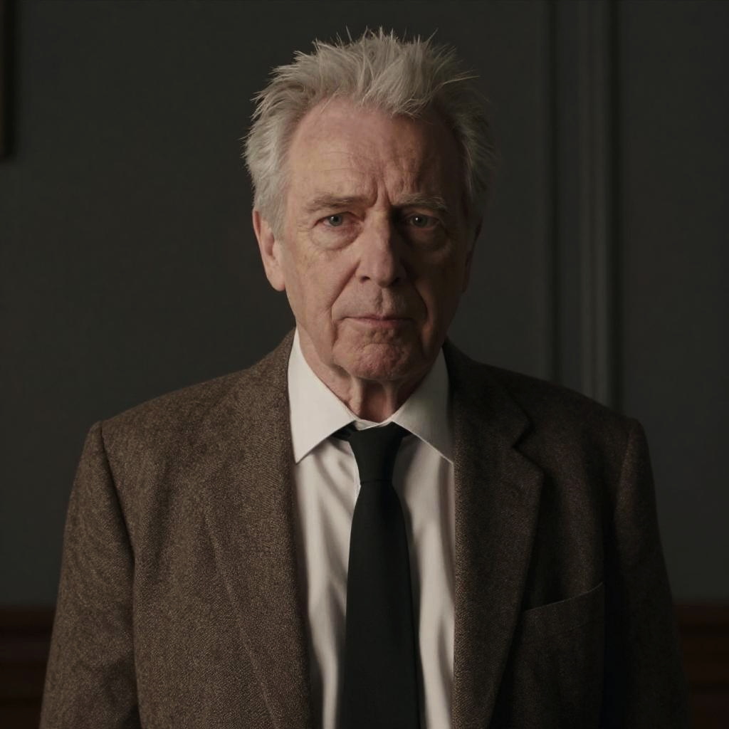Photograph of an older white man with short, spiky gray hair standing against a dark background. He's wearing a brown textured blazer, white dress shirt, and black tie. The lighting highlights his face, giving a serious yet gentle expression. The background is dimly lit with faint wall details. He looks like he's in a formal setting, possibly a movie or TV character.