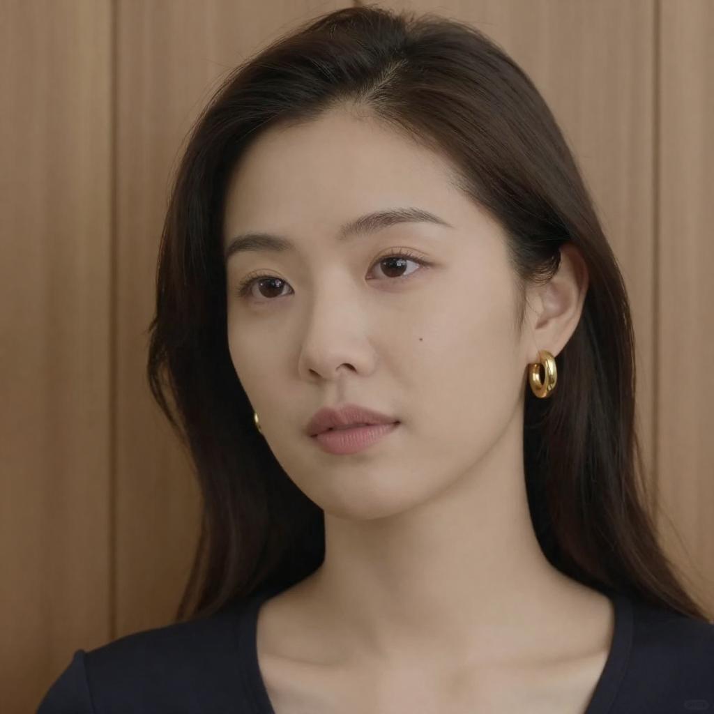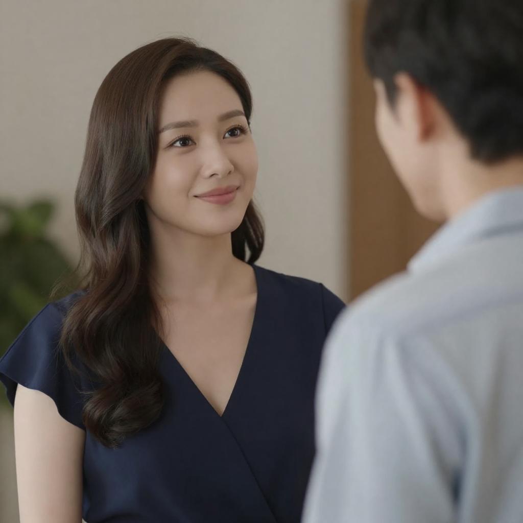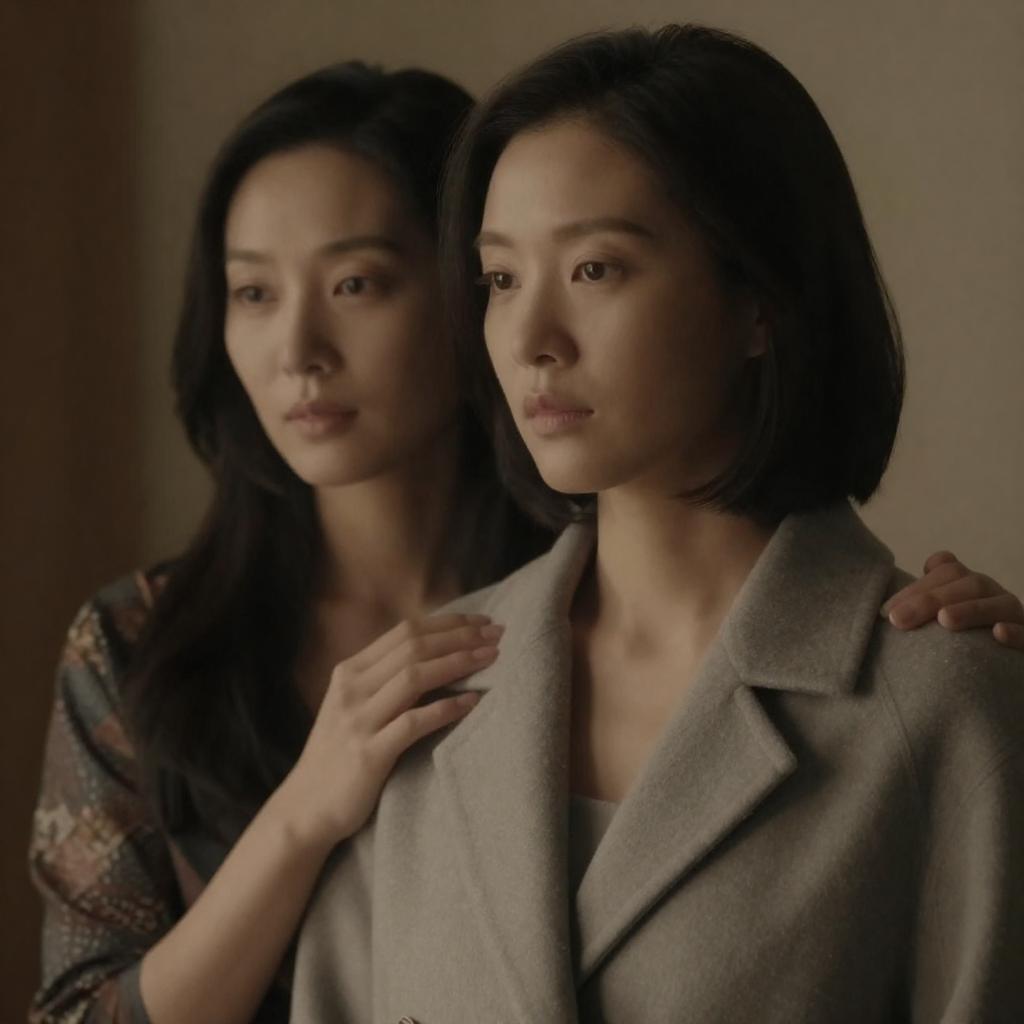 Two women sitting on grass, looking at each other. Left woman with blonde ponytail in gray blazer and pearl necklace, holding glass. Right woman with brown hair in pink blouse, looking down. Green background with blurred figures.