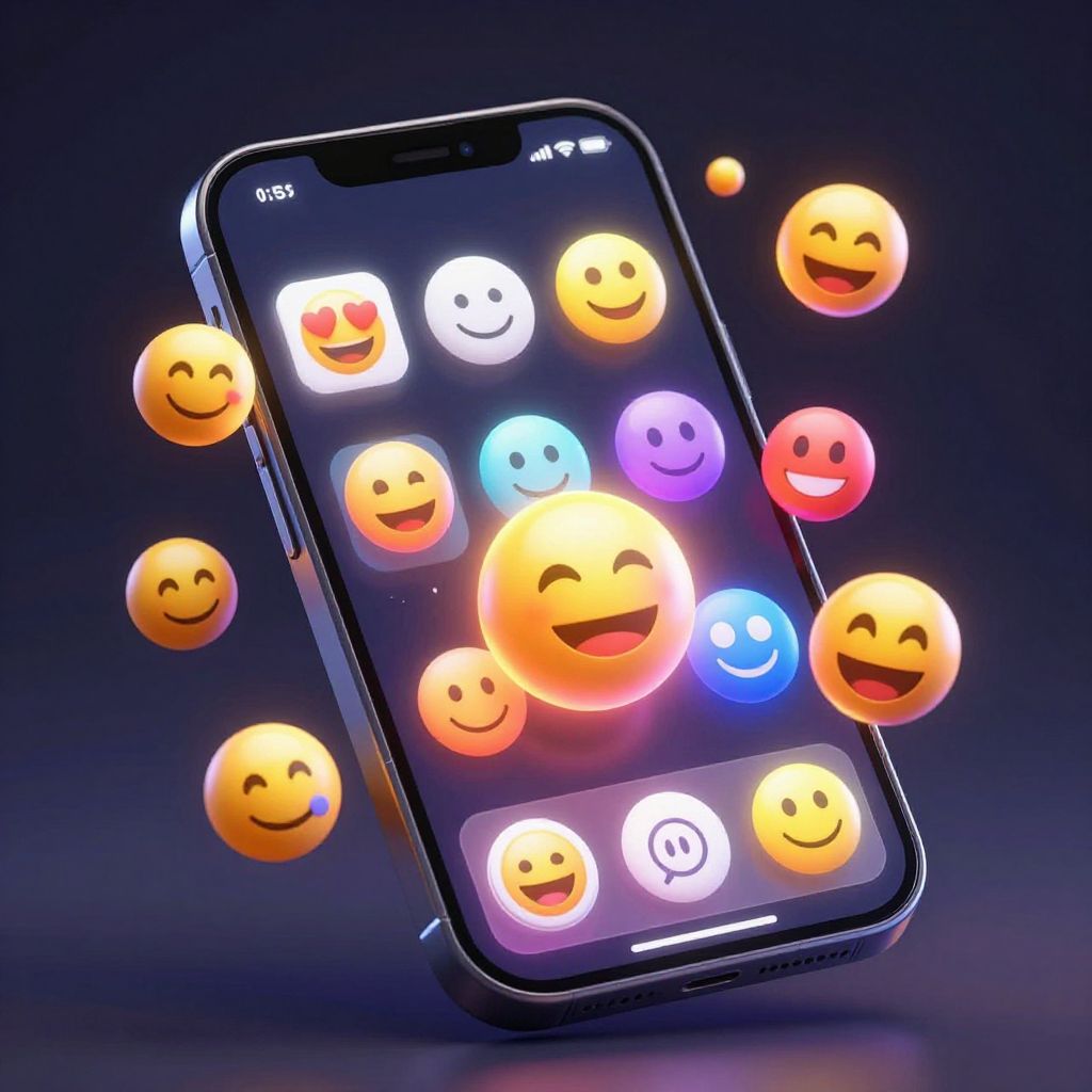 Emoji tool interface glowing on a sleek modern smartphone screen, vibrant colorful emoticons floating around, futuristic holographic design, soft neon lighting, digital creativity atmosphere, high detail, vibrant colors