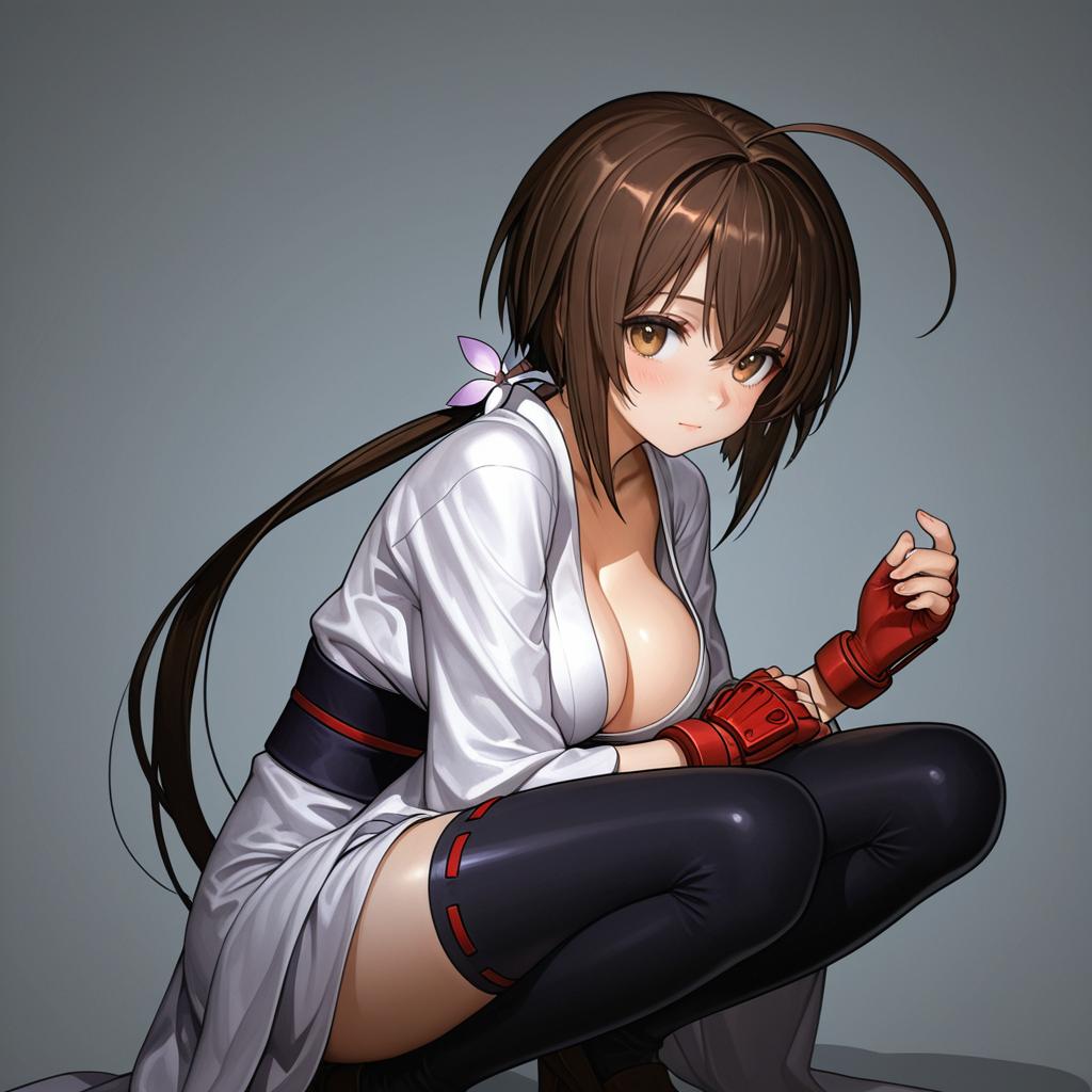 Digital anime-style drawing of a young woman with long, dark brown hair and yellow eyes. She is crouching, wearing a white, partially open kimono that reveals her large breasts, black thigh-high stockings, and red fingerless gloves. Her expression is neutral, with a slight blush on her cheeks. The background is a simple gradient from dark to light gray, emphasizing the character. The art style features sharp lines and vibrant colors, typical of modern anime illustrations. She has a single hair strand standing up, adding to her slightly shy or introspective demeanor.