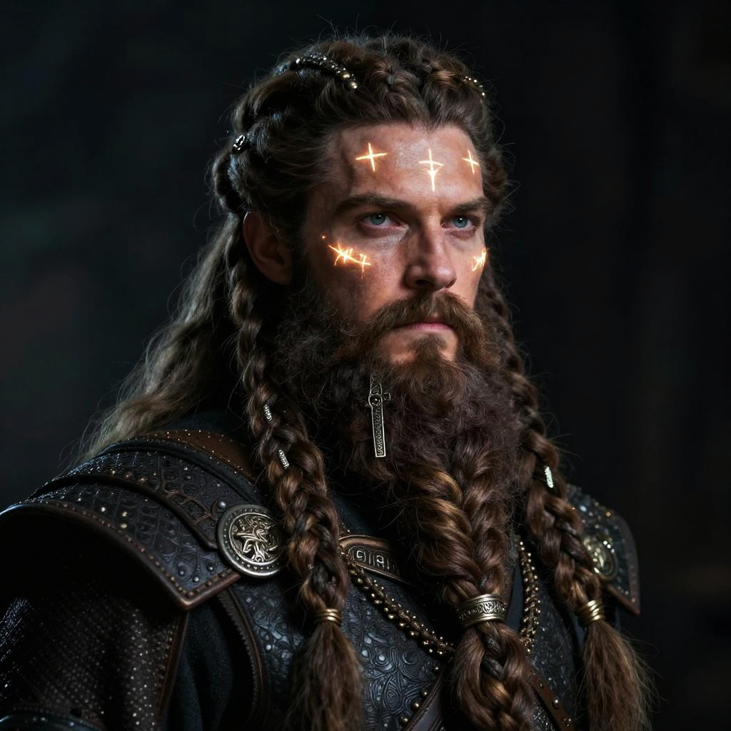 Beard styles fantasy warrior portrait, imposing man with thick braided beard, metallic accessories woven in beard strands, glowing runes on face, dark moody background, photorealistic with epic cinematic lighting
