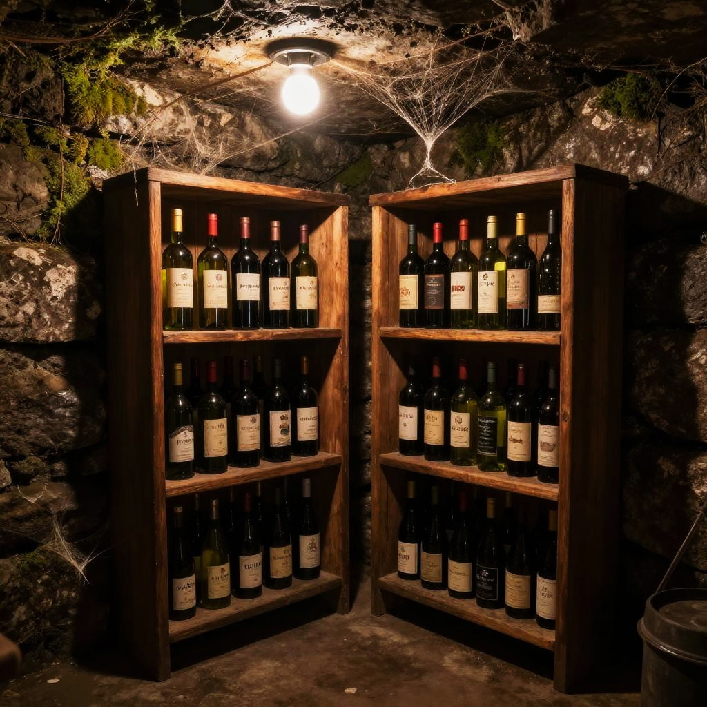Kellerraum interior, dimly lit underground cellar with old wooden shelves filled with vintage wine bottles, cobwebs in corners, stone walls with moss, atmospheric lighting casting shadows, rustic and mysterious ambiance, high detail, cinematic style