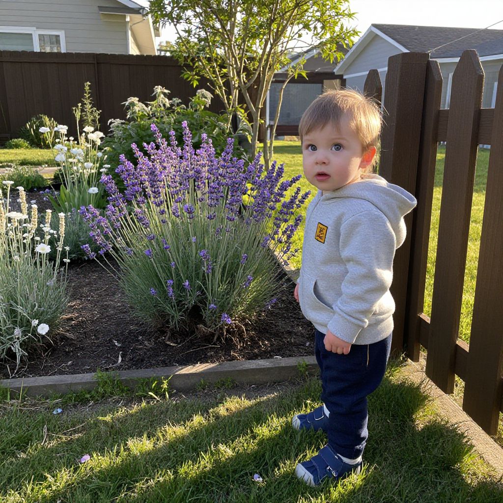 A suburban garden in spring, with blooming lavender and white flowers, a child with bright eyes and a curious expression standing near a wooden fence, wearing a soft grey hoodie with a small patch, the light golden hour casting long shadows across the grass.