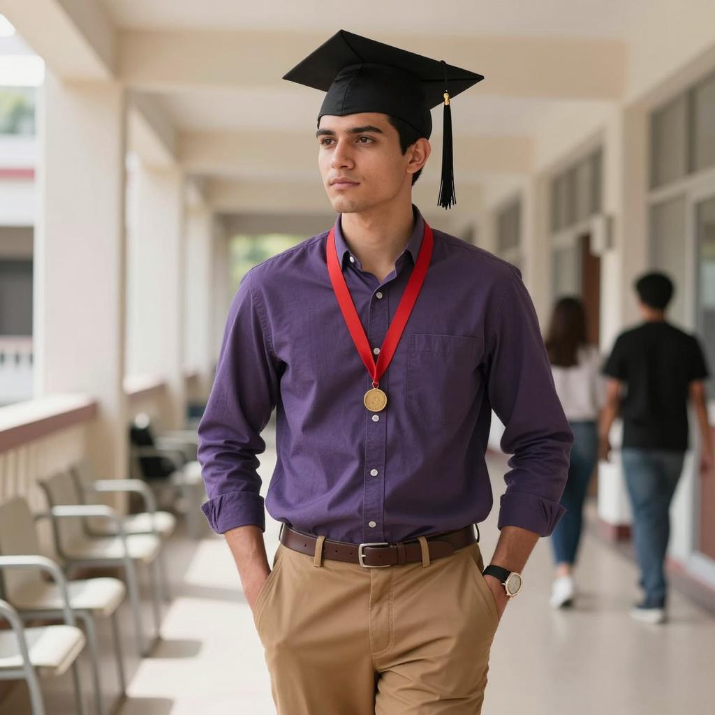 Dark academia man outfit, photograph of a bearded man standing, wearing black graduation gown with gold and red accents, black cap with yellow tassel, black suit, white shirt, serious expression, hands in pockets, plain beige background, full body, studio lighting, realistic style