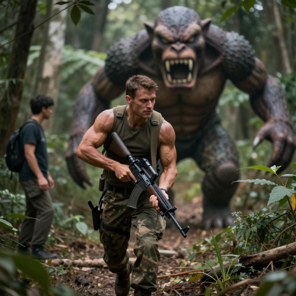 Photograph of a muscular man in camouflage gear, holding a rifle, running through a forest. A large, menacing creature with sharp teeth and a snarling expression is in the background. Dense green foliage surrounds them. Two people. Intense facial expression on creature.