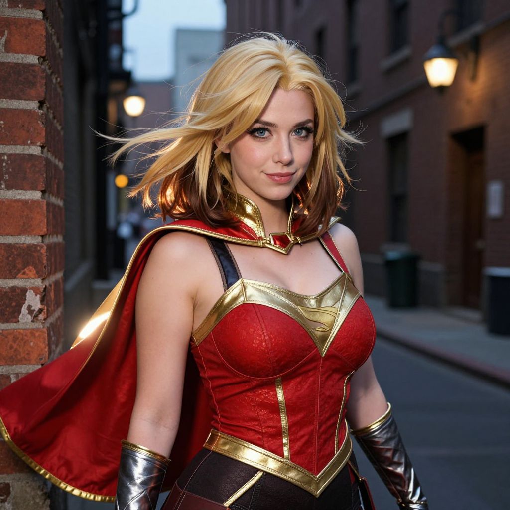 A young woman with vibrant blonde hair and brown shoulder-length strands wears a detailed, vintage superhero costume in a dimly lit city alley at dusk, the costume features red and gold accents with a glowing cape that swirls slightly in the wind, she has clear blue eyes, a defined facial structure, and a playful smirk as she stands against a crumbling brick wall with streetlights flickering in the background.. The woman has big tits and cute face