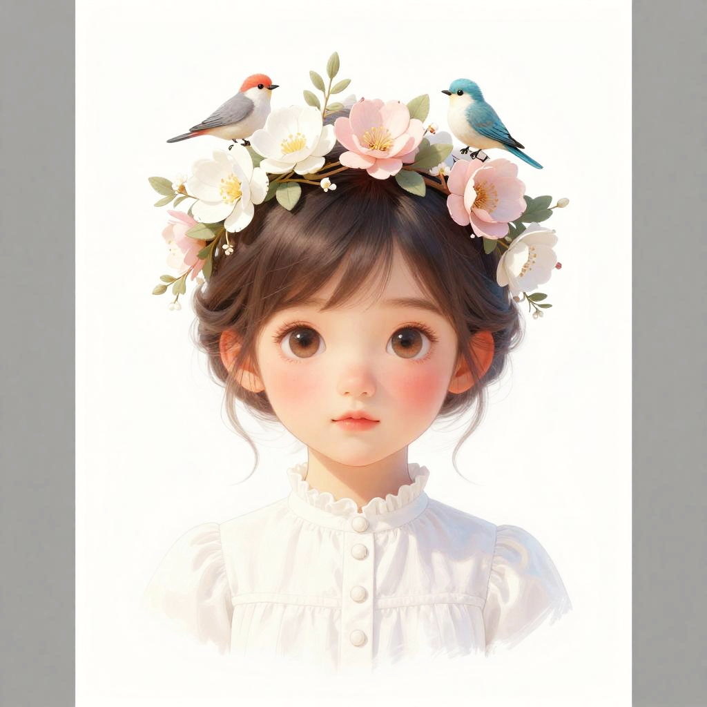 This is a digital, semi-realistic drawing of a cute, young girl with large, brown eyes and rosy cheeks. She has a delicate, fair complexion and wears a white dress with a high collar and buttons. Her head is adorned with a floral crown featuring white and pink flowers, with tiny blue birds perched on top. The background is a simple white vertical stripe, contrasting with the grey edges of the image.
